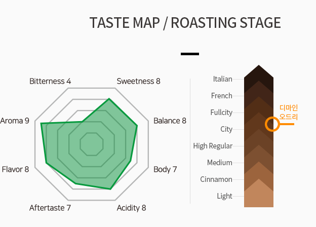 깔끔한 후미와 화사한 향미로 여성분들께 인기있는 커피 입니다.